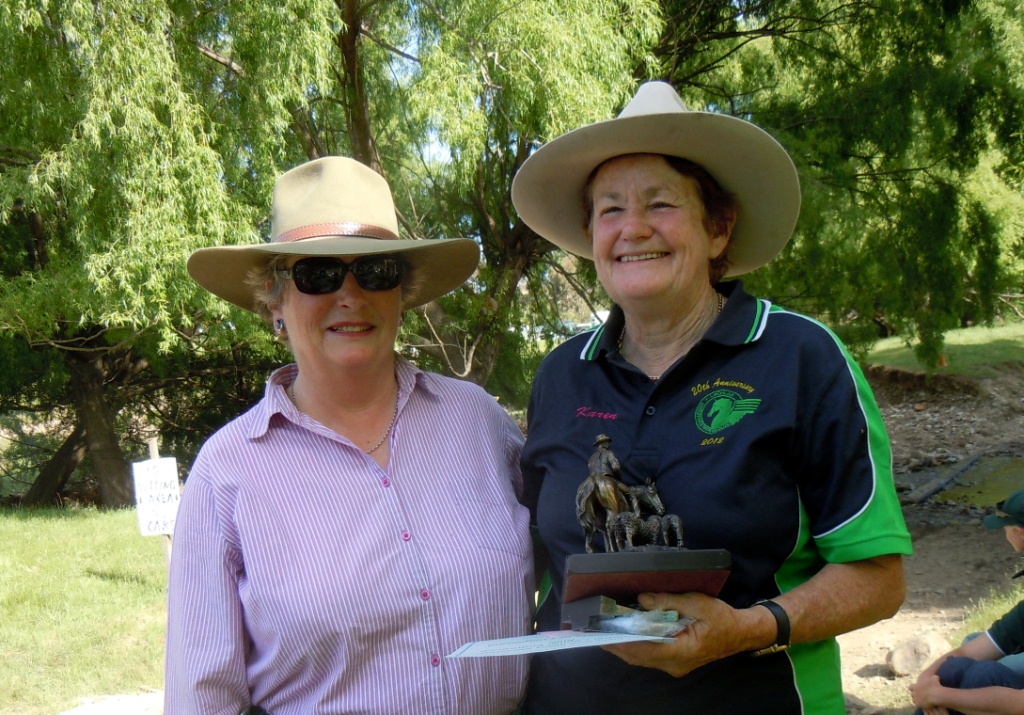 ACTERA president Michelle O'Leary presenting awards to first placegetters, left to right: Frank Mollema (heavyweight); Jenny Shepheard (middleweight) (Maxine McArthur at left); April Newman (lightweight); and Cybele Coddington (junior). Photos by Roz Edmunds The Allen Blundell Memorial Trophy was won by Karen Rhodes, who completed the ride on her six-year-old Arabian gelding Stratfield Ghayth. The Bruce Neal Trophy for junior riders was awarded to Olivia De Gruchy, riding Blake's Heaven Ventura.